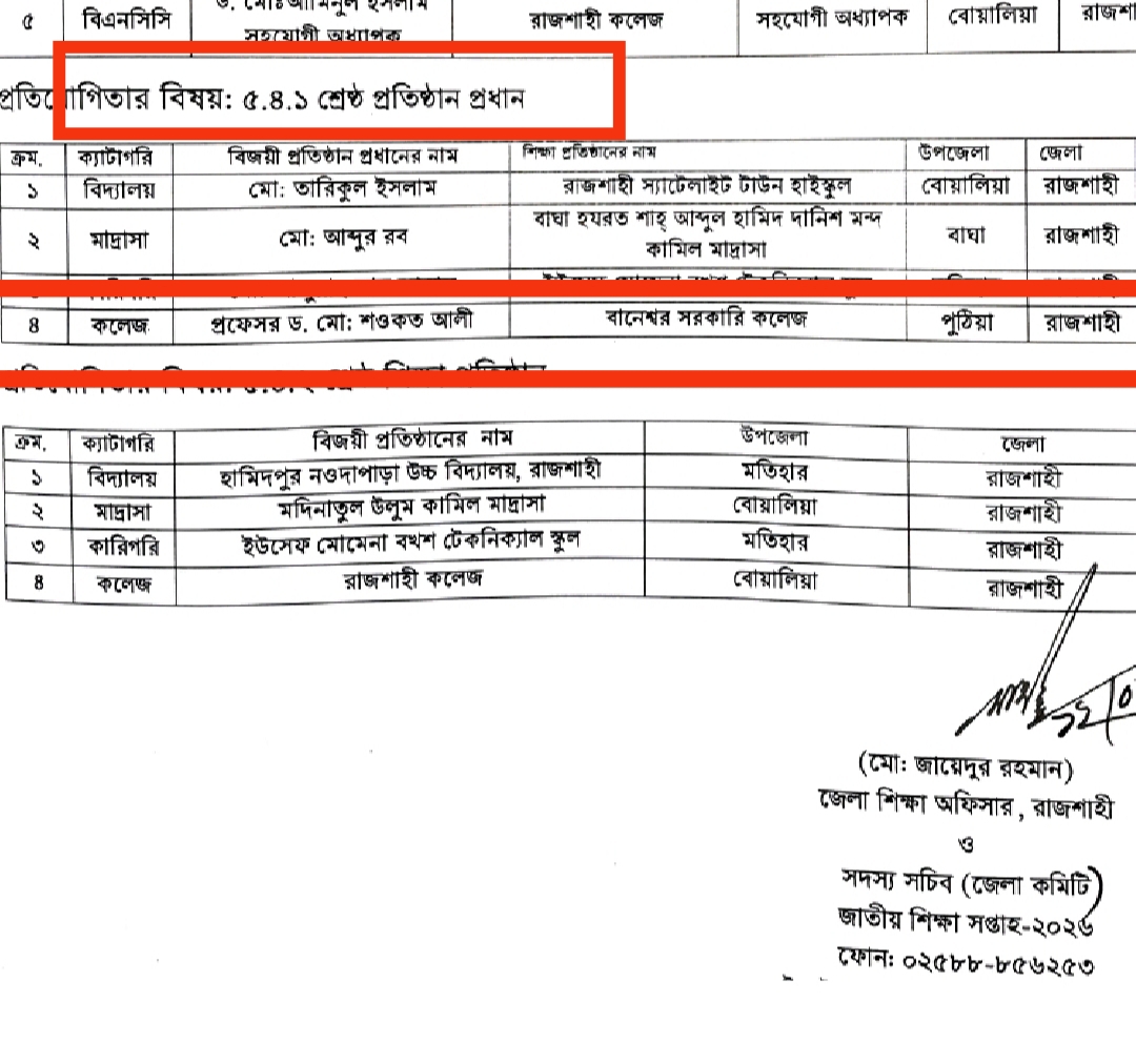 জাতীয় শিক্ষা সপ্তাহ -২০২৬ উপলক্ষ্যে জেলা পর্যায়ে শ্রেষ্ঠ প্রতিষ্ঠান প্রধান প্রফেসর ড. শওকত আলী, অধ্যক্ষ, বানেশ্বর সরকারি কলেজ, পুঠিয়া, রাজশাহী।