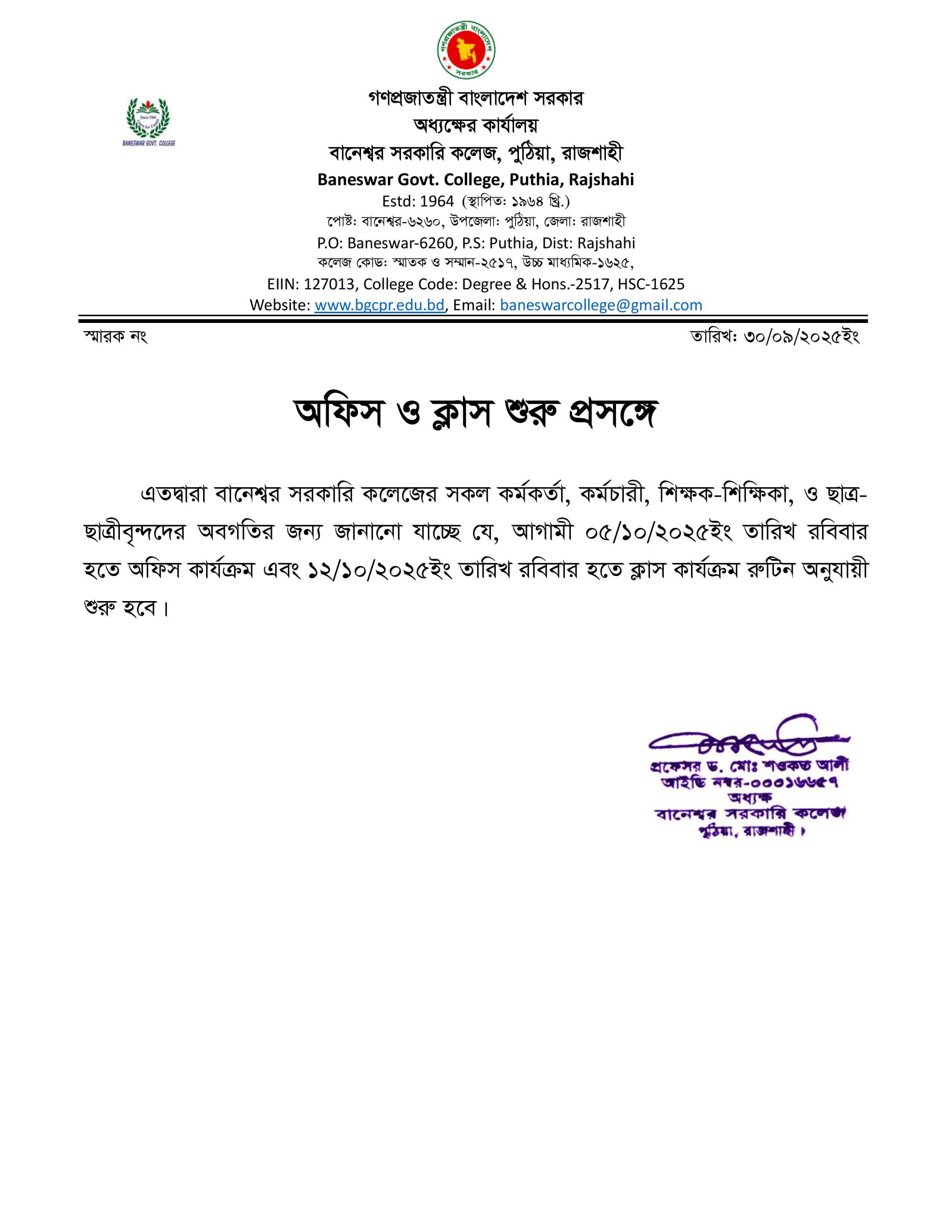 অফিস ও ক্লাস শুরু প্রসঙ্গে