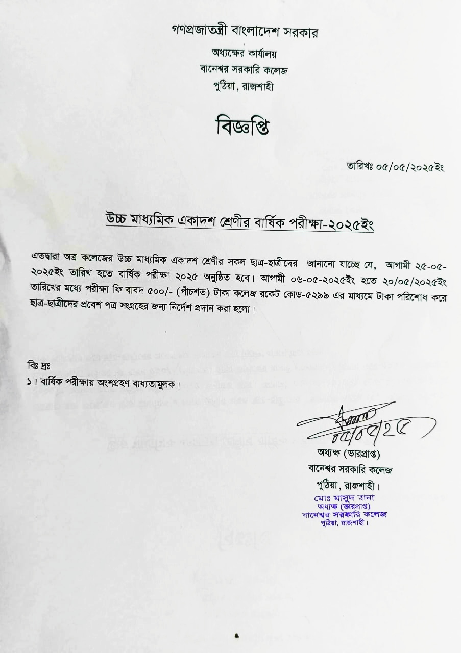 4 উচ্চ মাধ্যমিক একাদশ শ্রেণীর বার্ষিক পরিক্ষা ফি – ২০২৫ ইং May 11, 2025